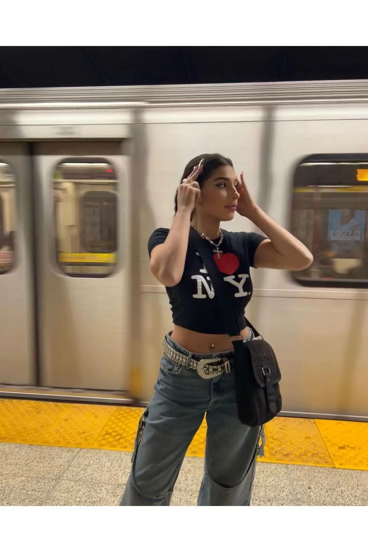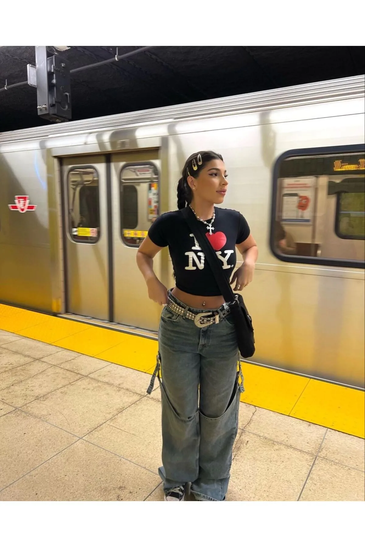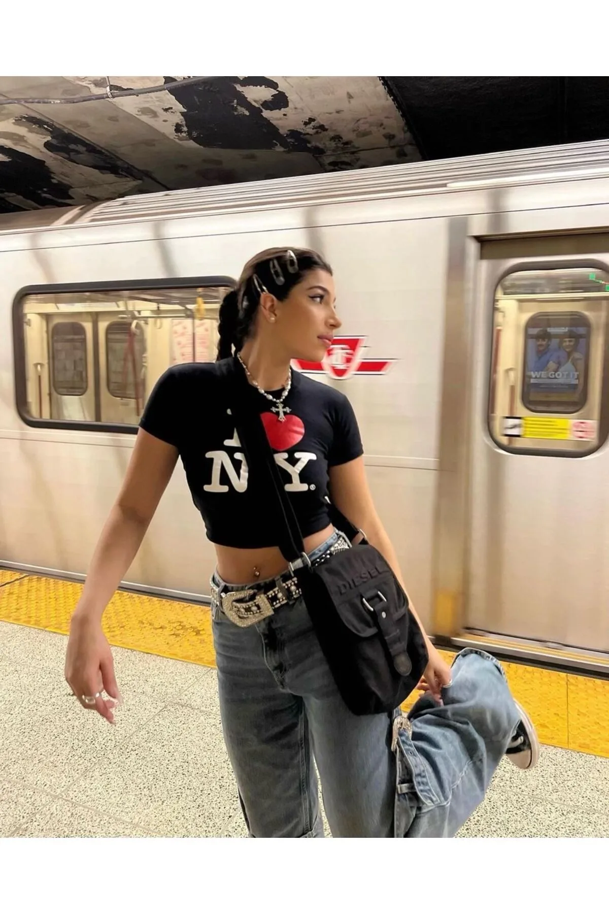 Siyah I Love NY Beyaz Yazılı Detail Bluz Body Crop Top