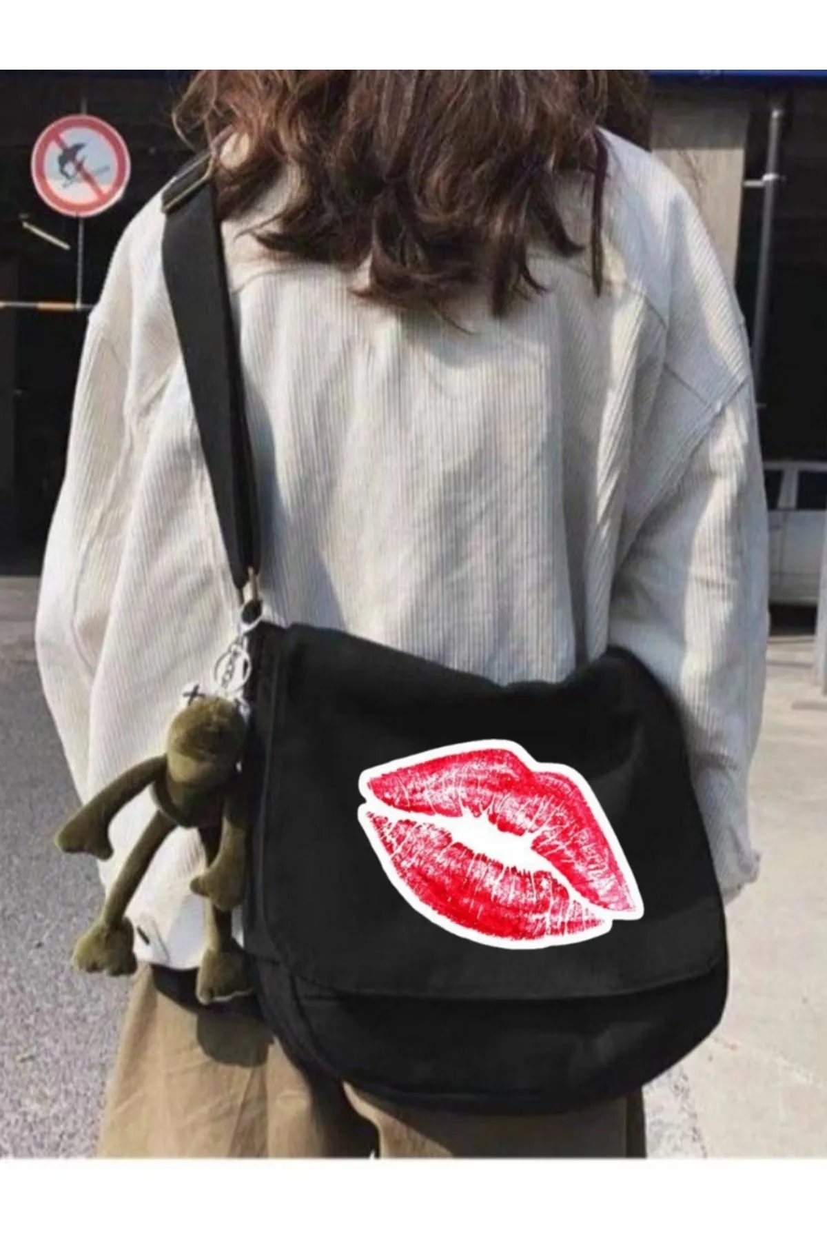 Siyah Kırmızı Dudak Öpücük Baskılı Unisex Askılı Postacı Çanta