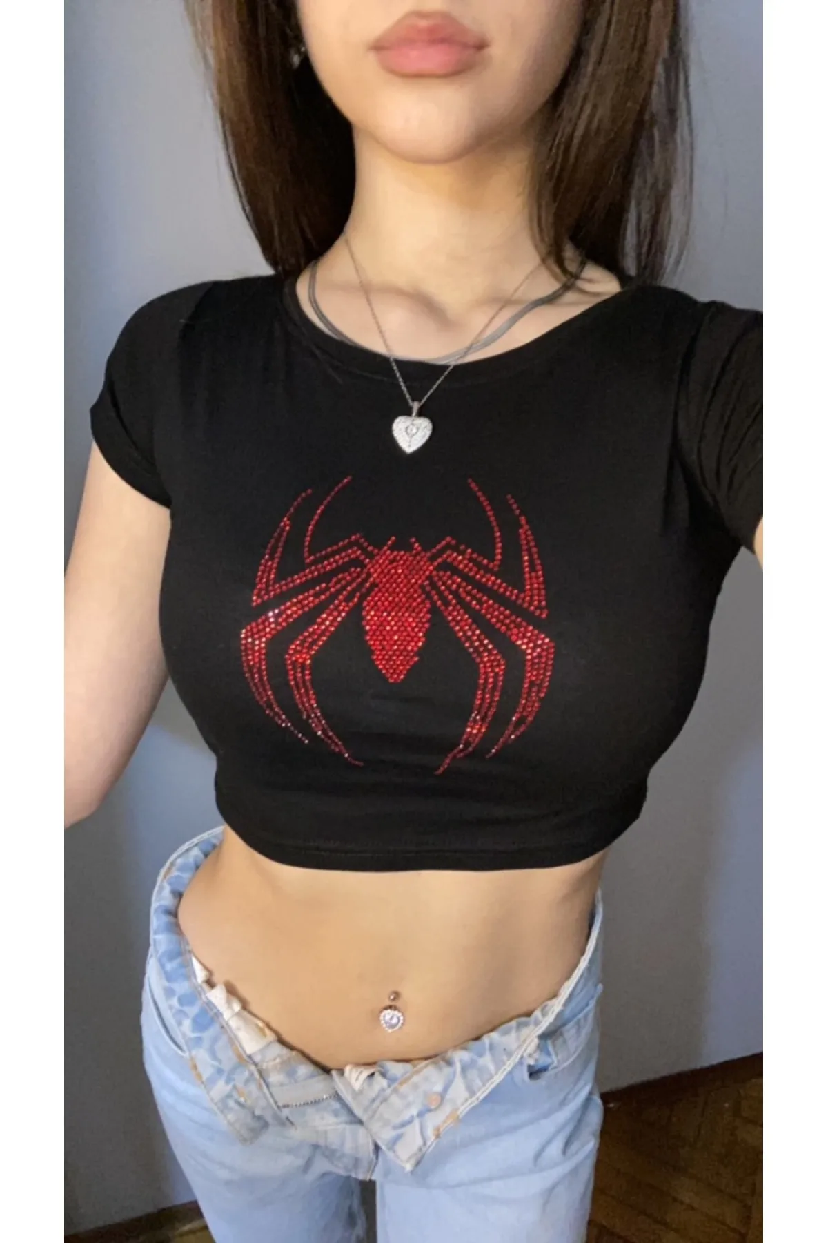 SİYAH KIRMIZI PARILTILI TAŞLI ÖRÜMCEK ADAM SPİDERMAN CROP