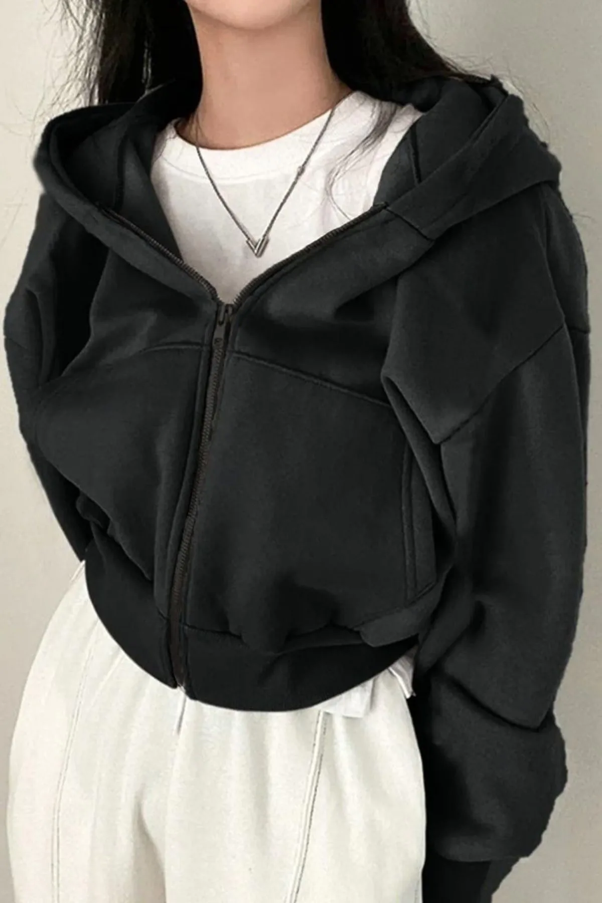 Siyah Korse Kesim Kapüşonlu Crop Hırka