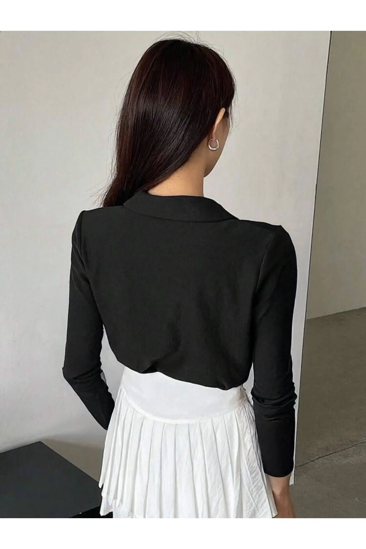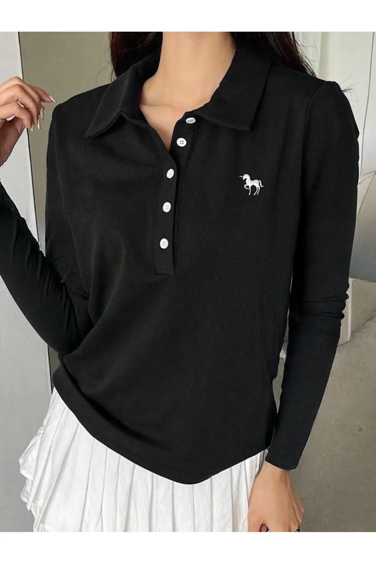 Siyah Nakışlı Polo Yaka Uzun Kol T-shirt