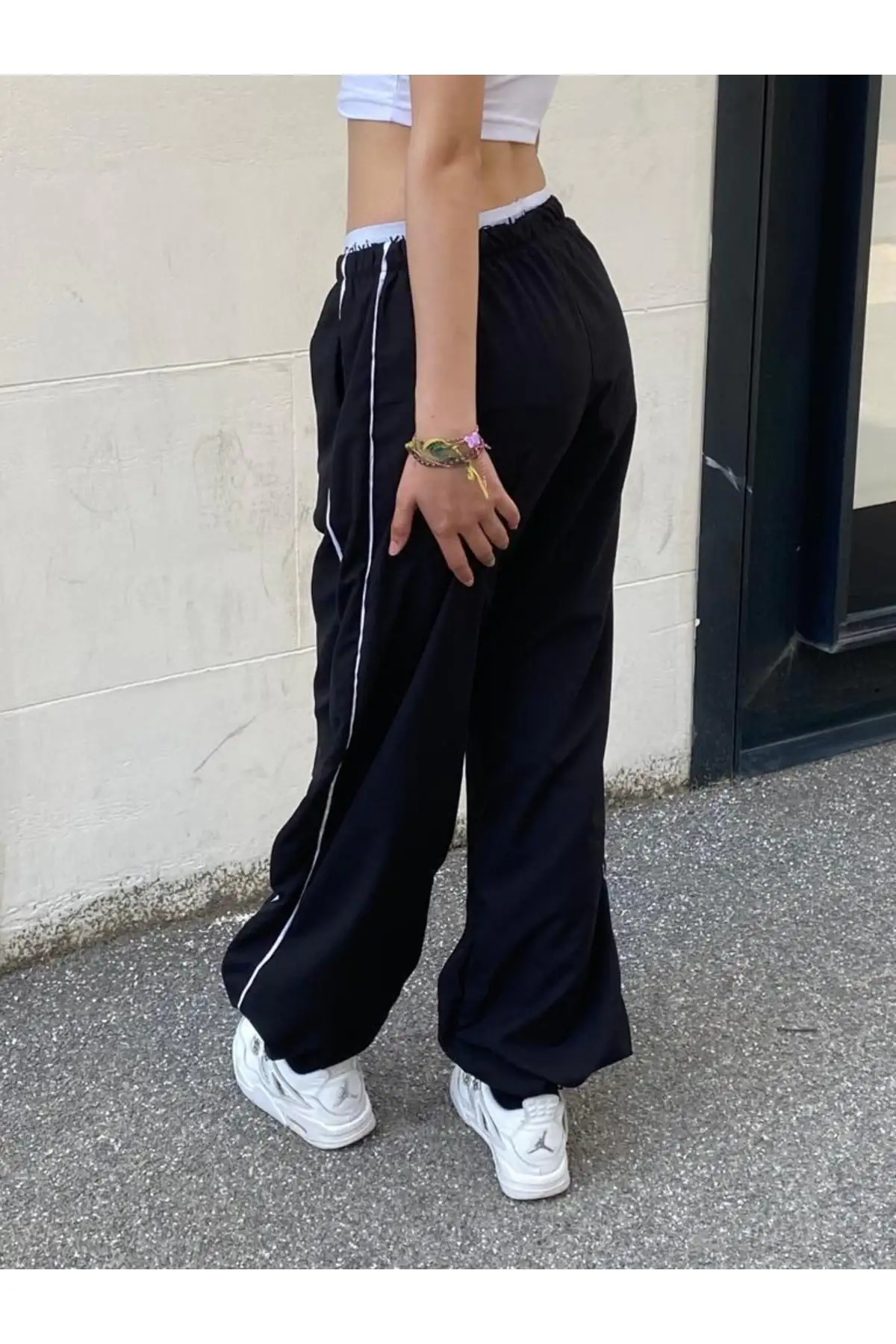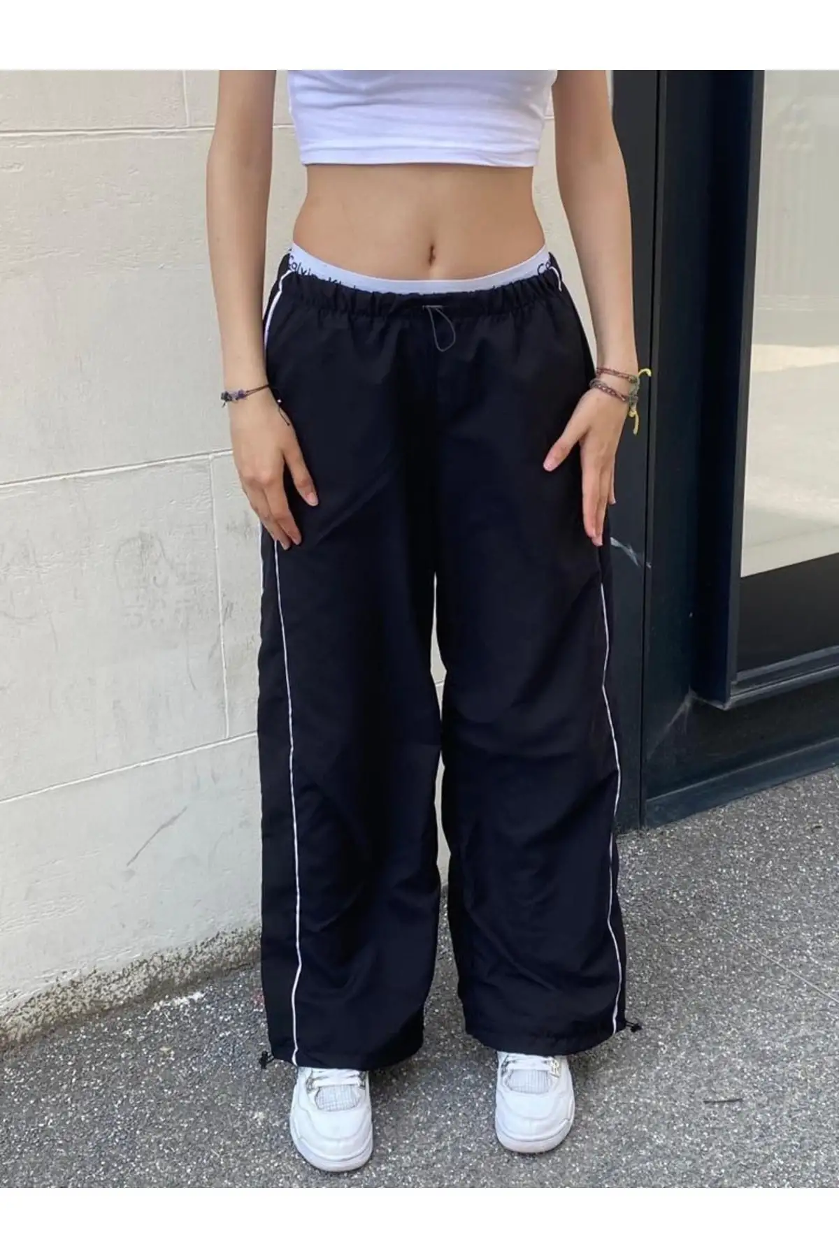 SİYAH BELİ LASTİKLİ ŞERİTLİ PARAŞÜT BAGGY PANTOLON