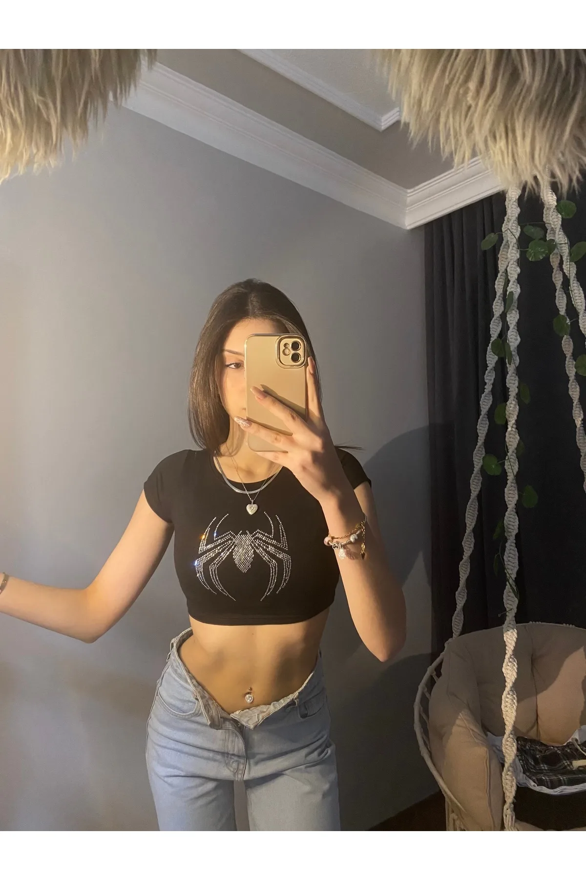 Siyah Parıltılı Taşlı Örümcek Adam Spiderman Desen Kadın Crop Body