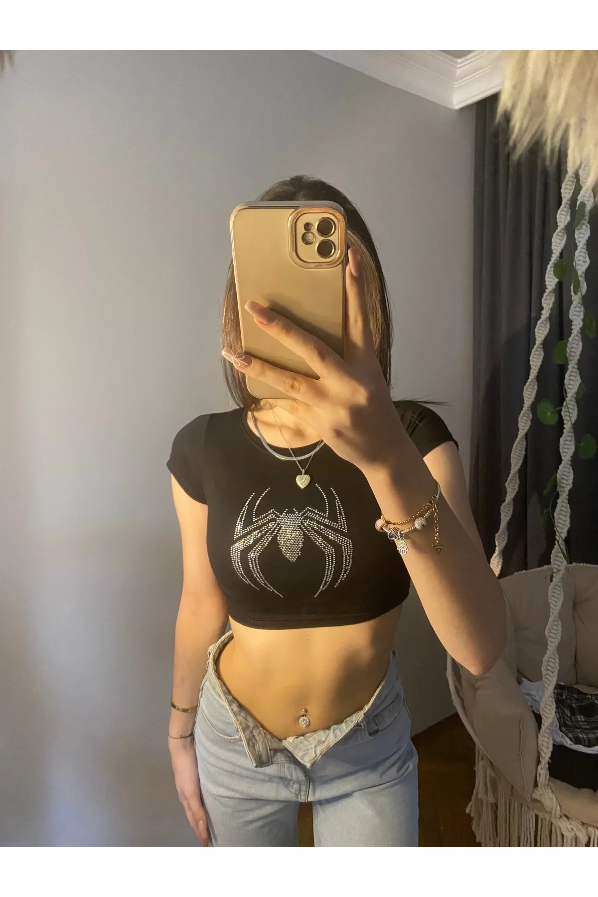 Siyah Parıltılı Taşlı Örümcek Adam Spiderman Desen Kadın Crop Body