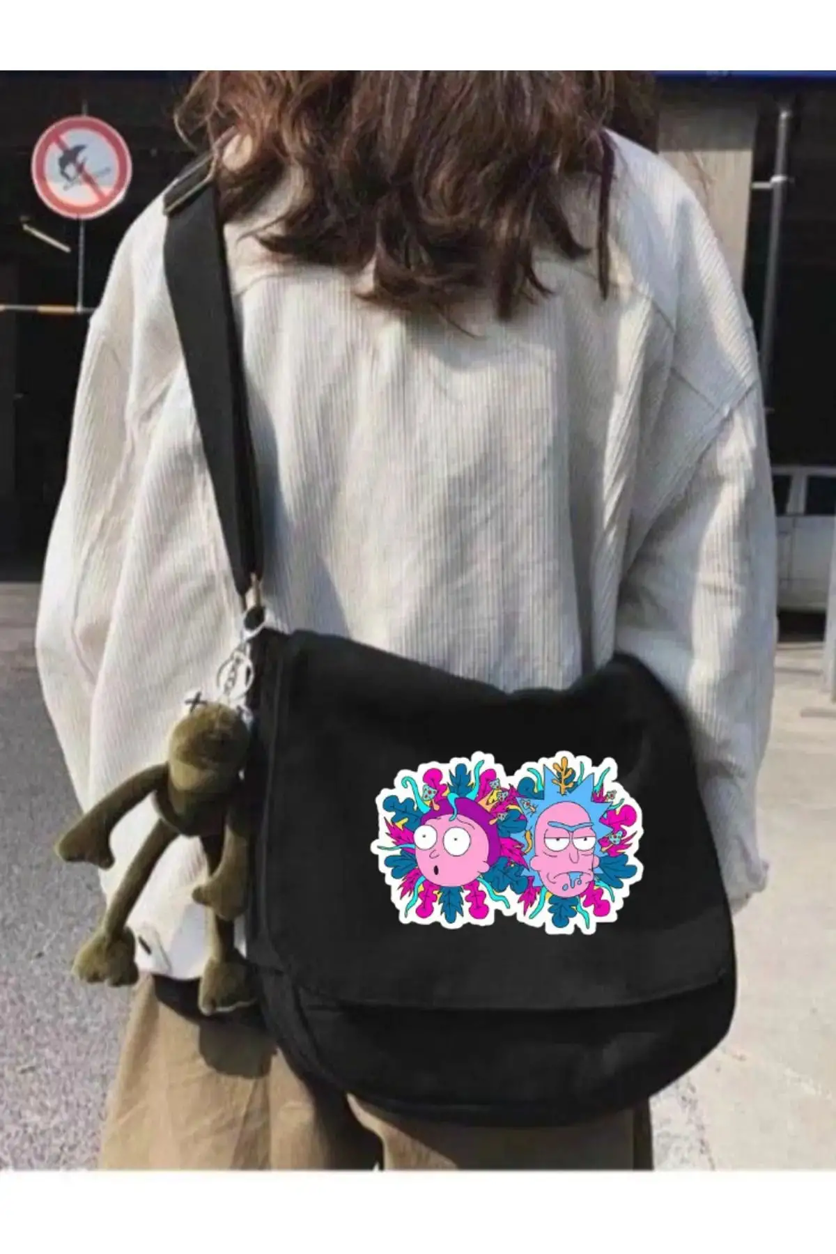Siyah Pembe Rick and Morty Baskılı Unisex Askılı Postacı Çanta