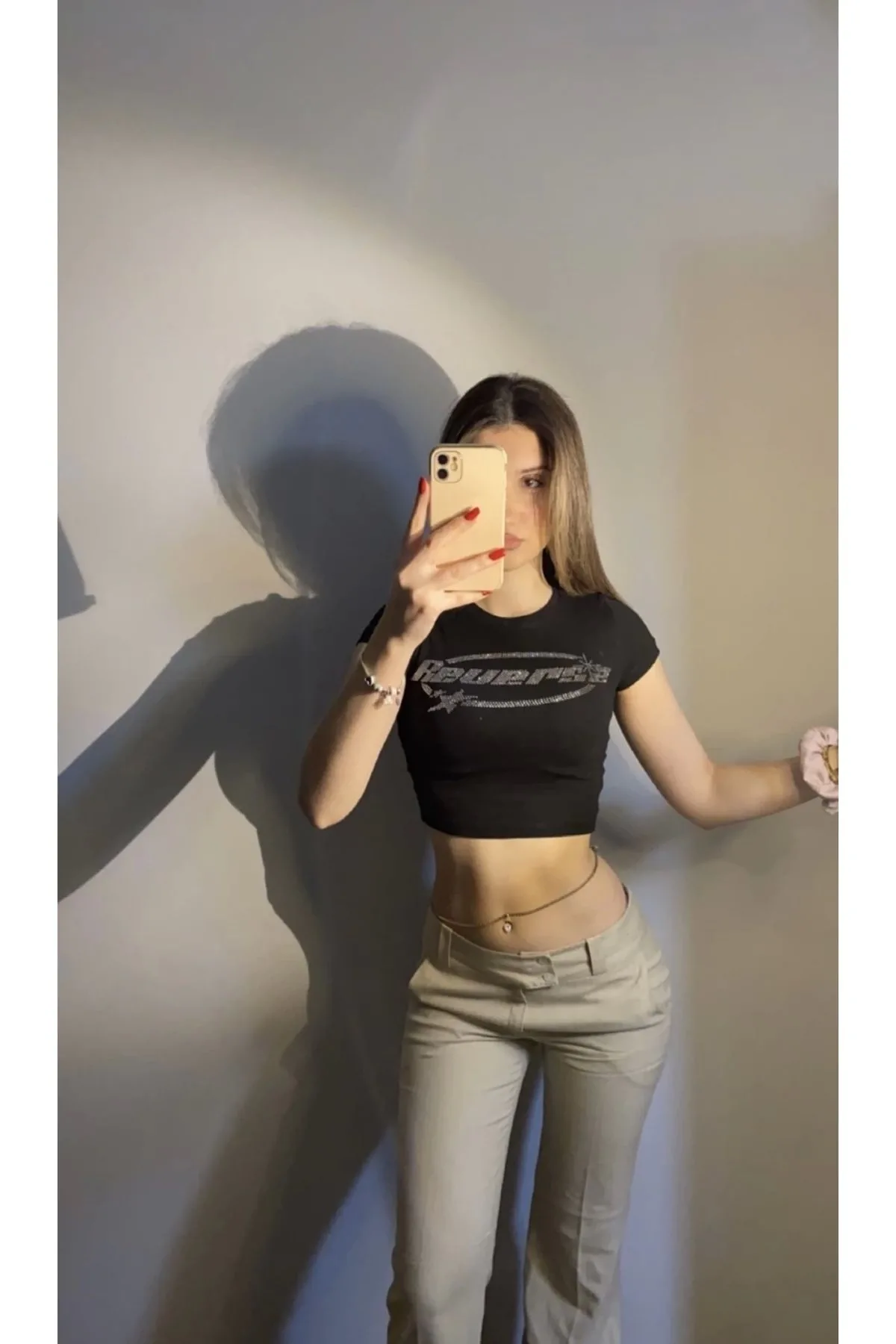 Siyah Reverse Parıltılı Taşlı Crop Body