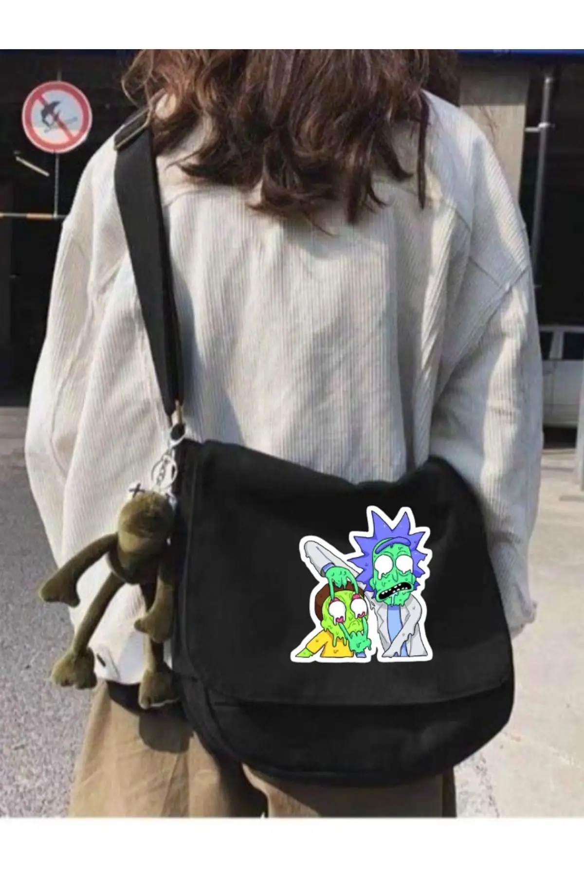 Siyah Rick and Morty Baskılı Unisex Askılı Postacı Çanta