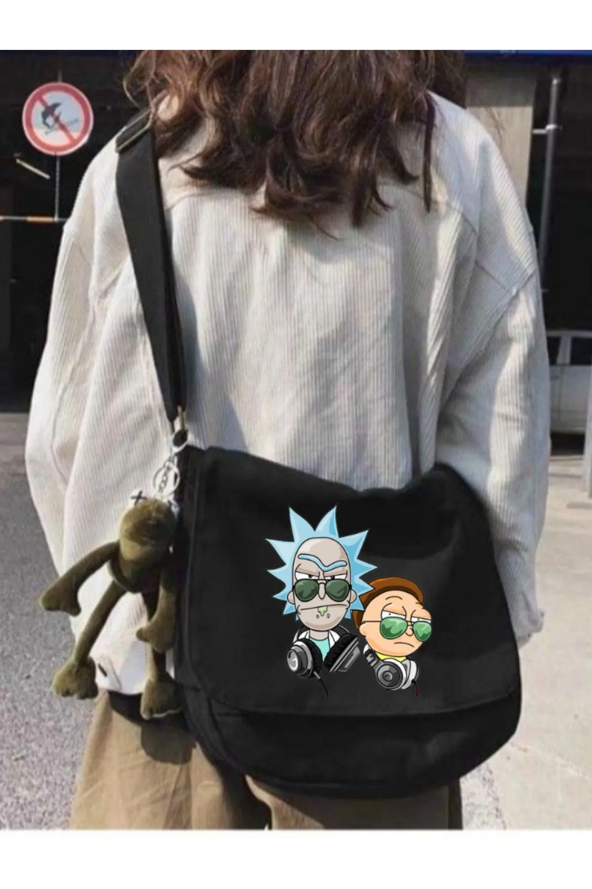 Siyah Rick and Morty Model Baskılı Unisex Askılı Postacı Çanta