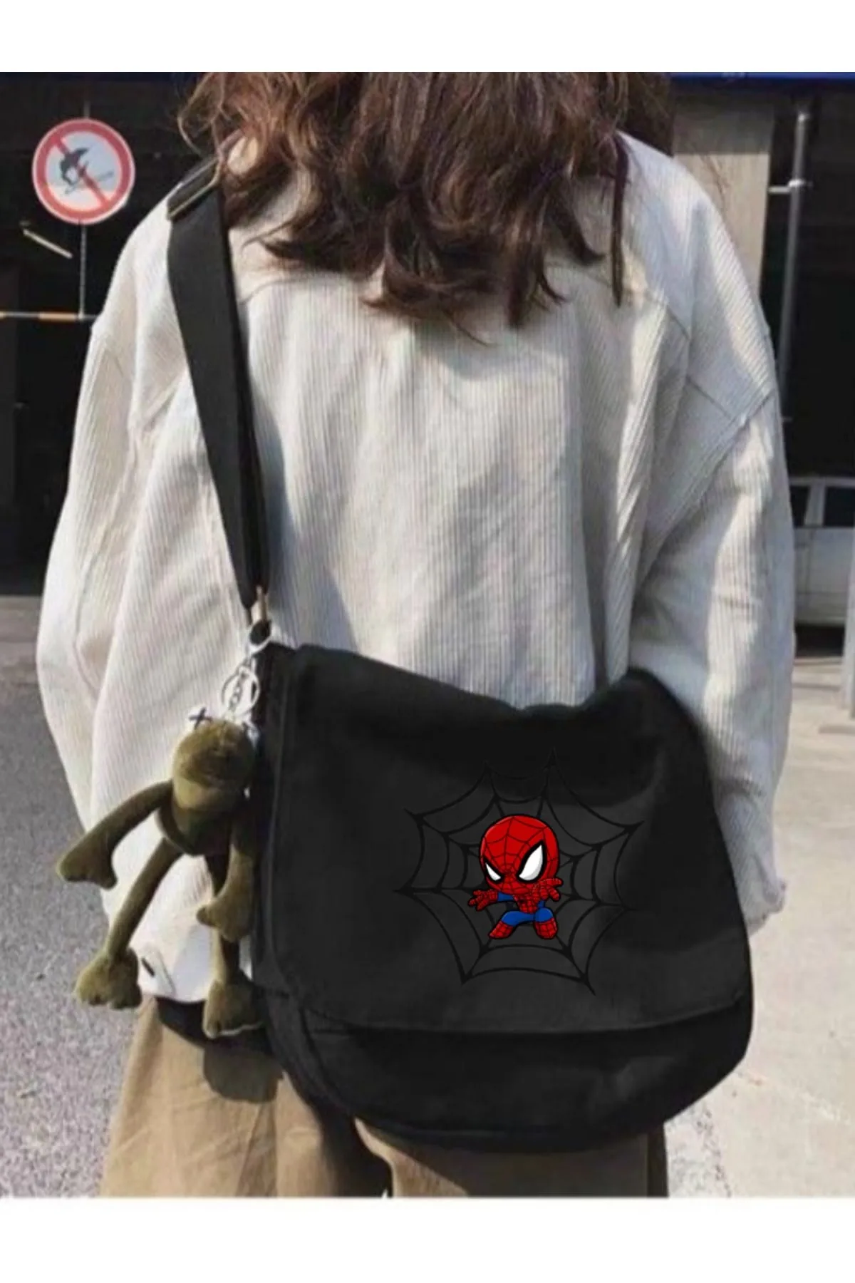 Siyah Spiderman Örümcek Adam Ağ Baskılı Unisex Askılı Postacı Çanta