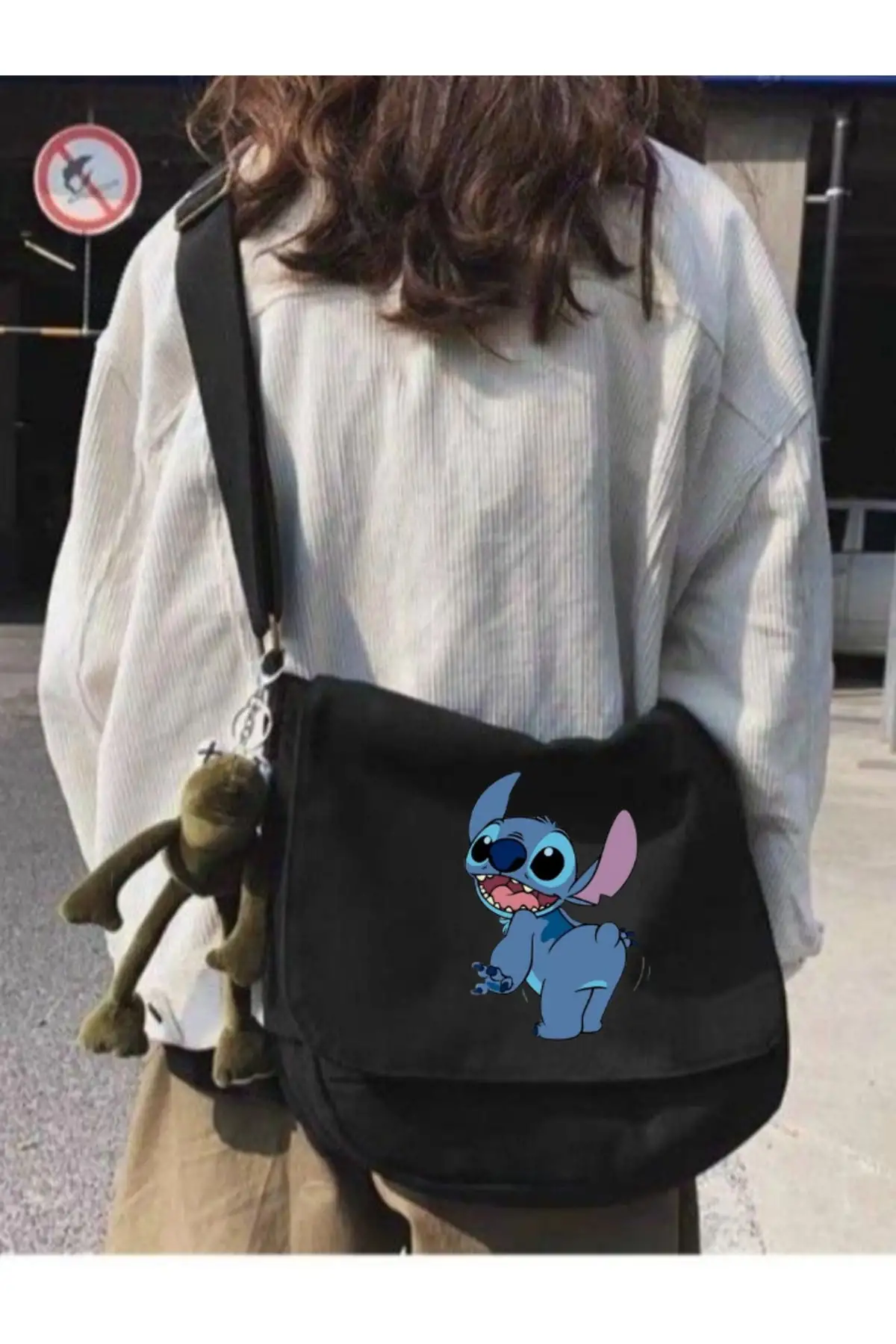 Siyah Stitch Baskılı Unisex Askılı Postacı Çanta