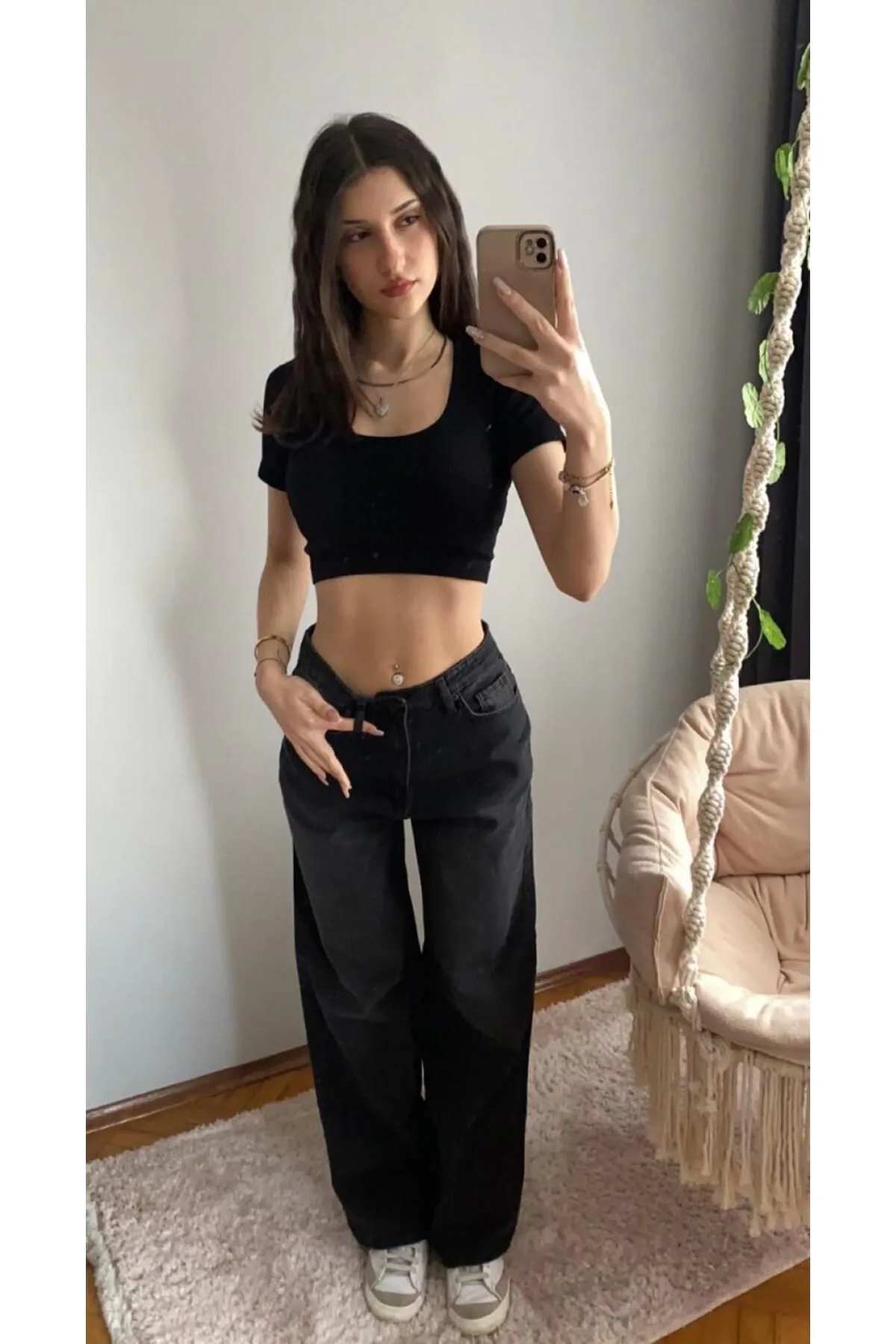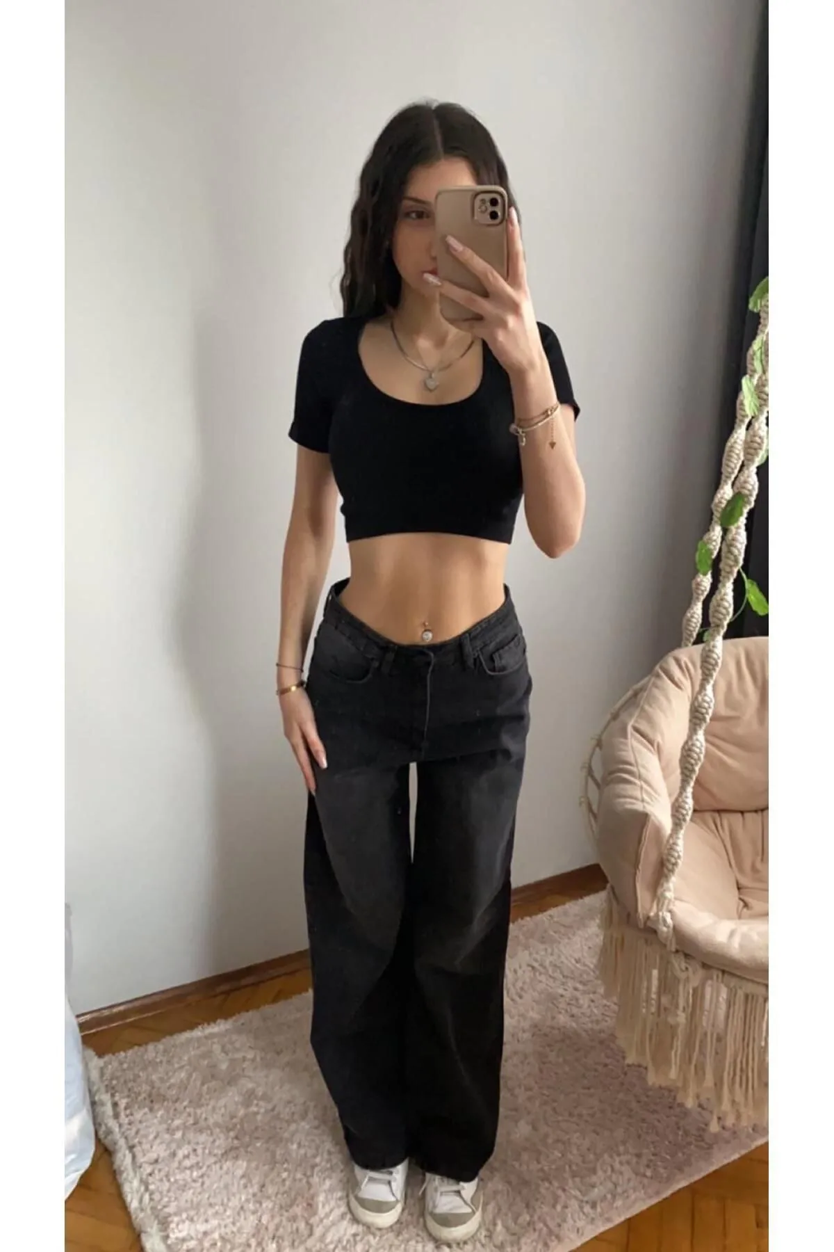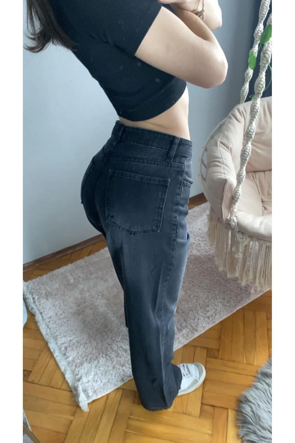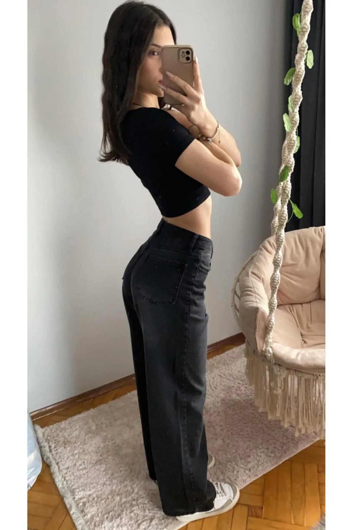 Siyah Yıkamalı Model Wide Leg Baggy Jean