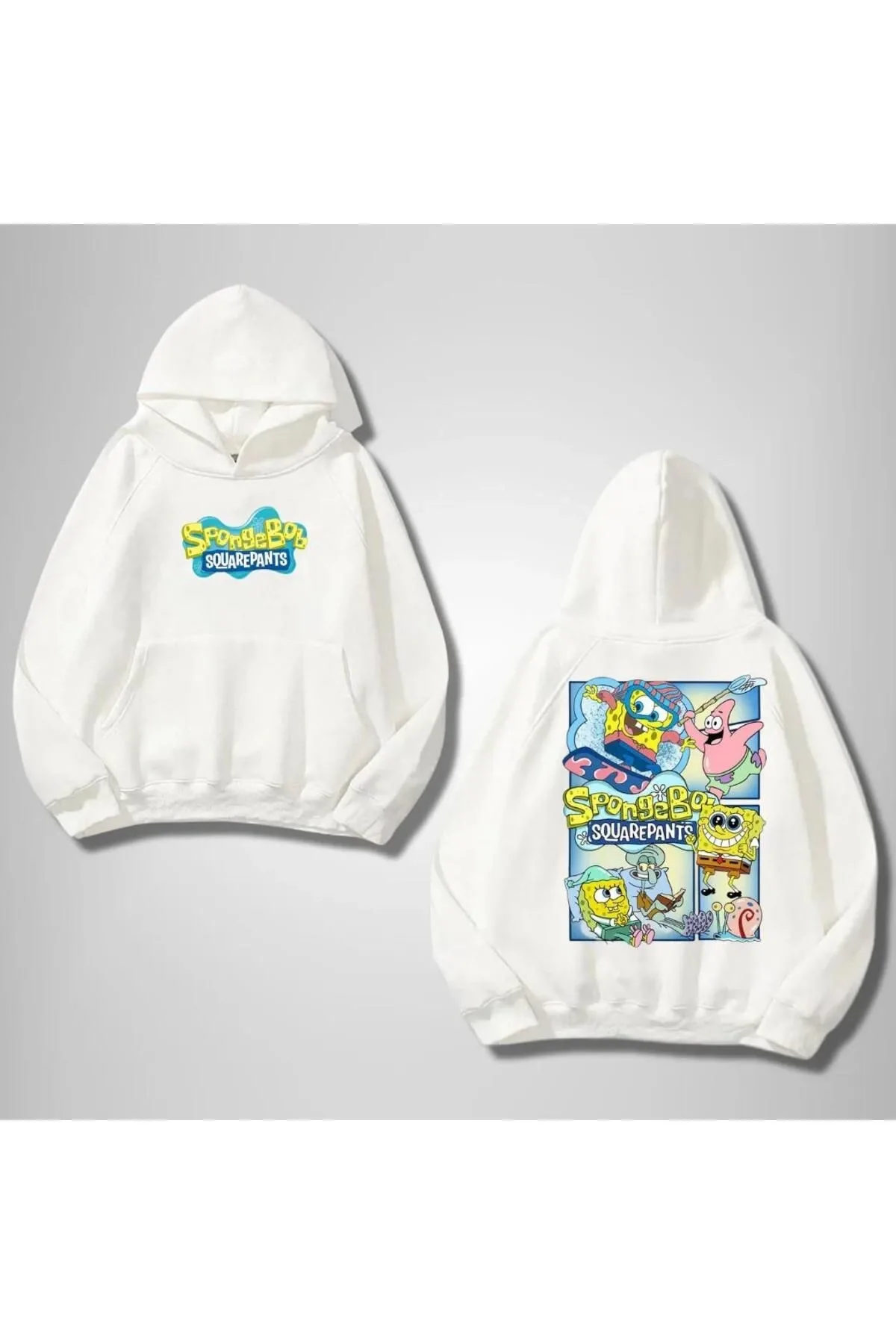 SpongeBob Friends Ön Arka Baskılı Beyaz Kapşonlu Sweatshirt