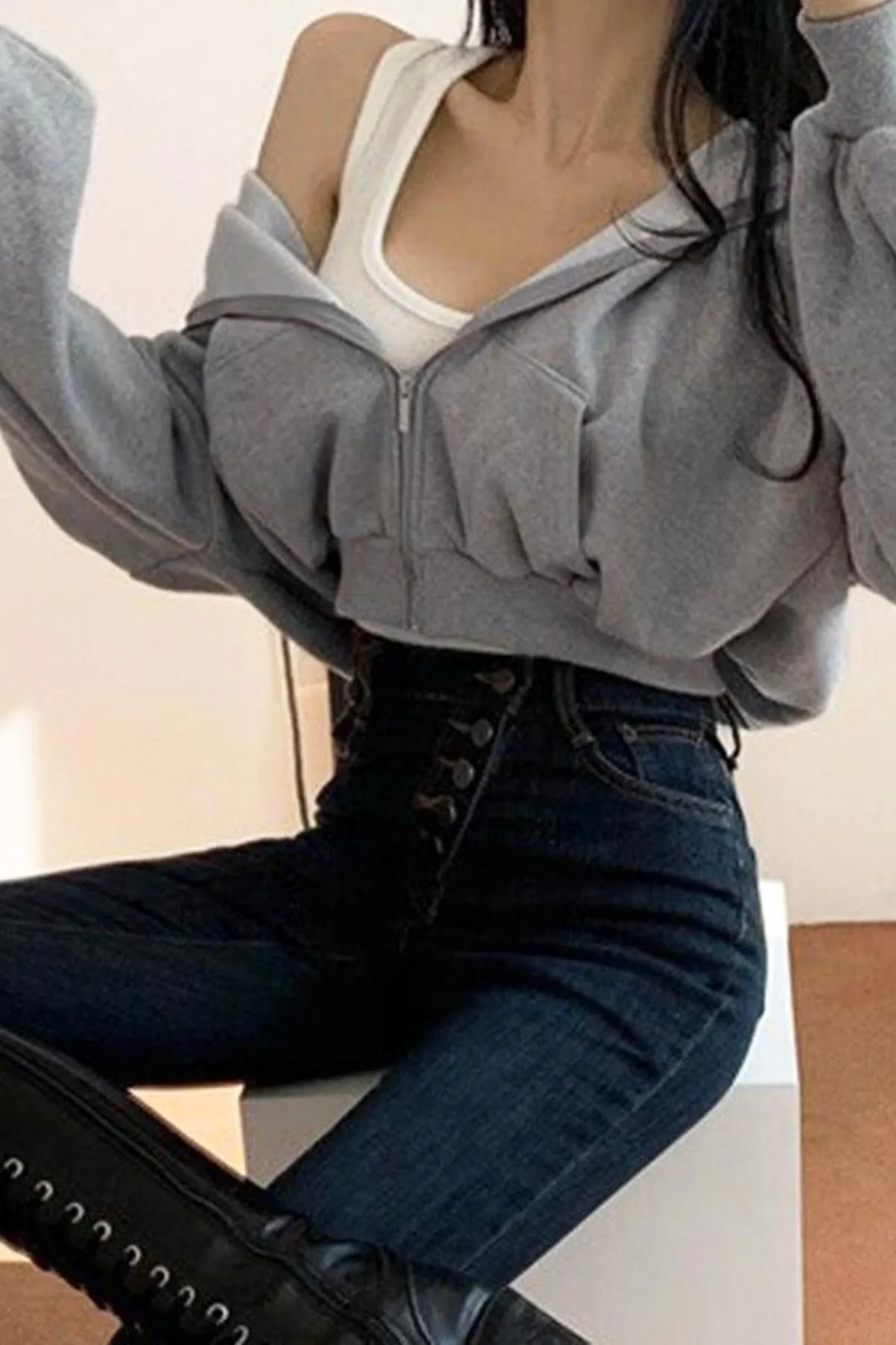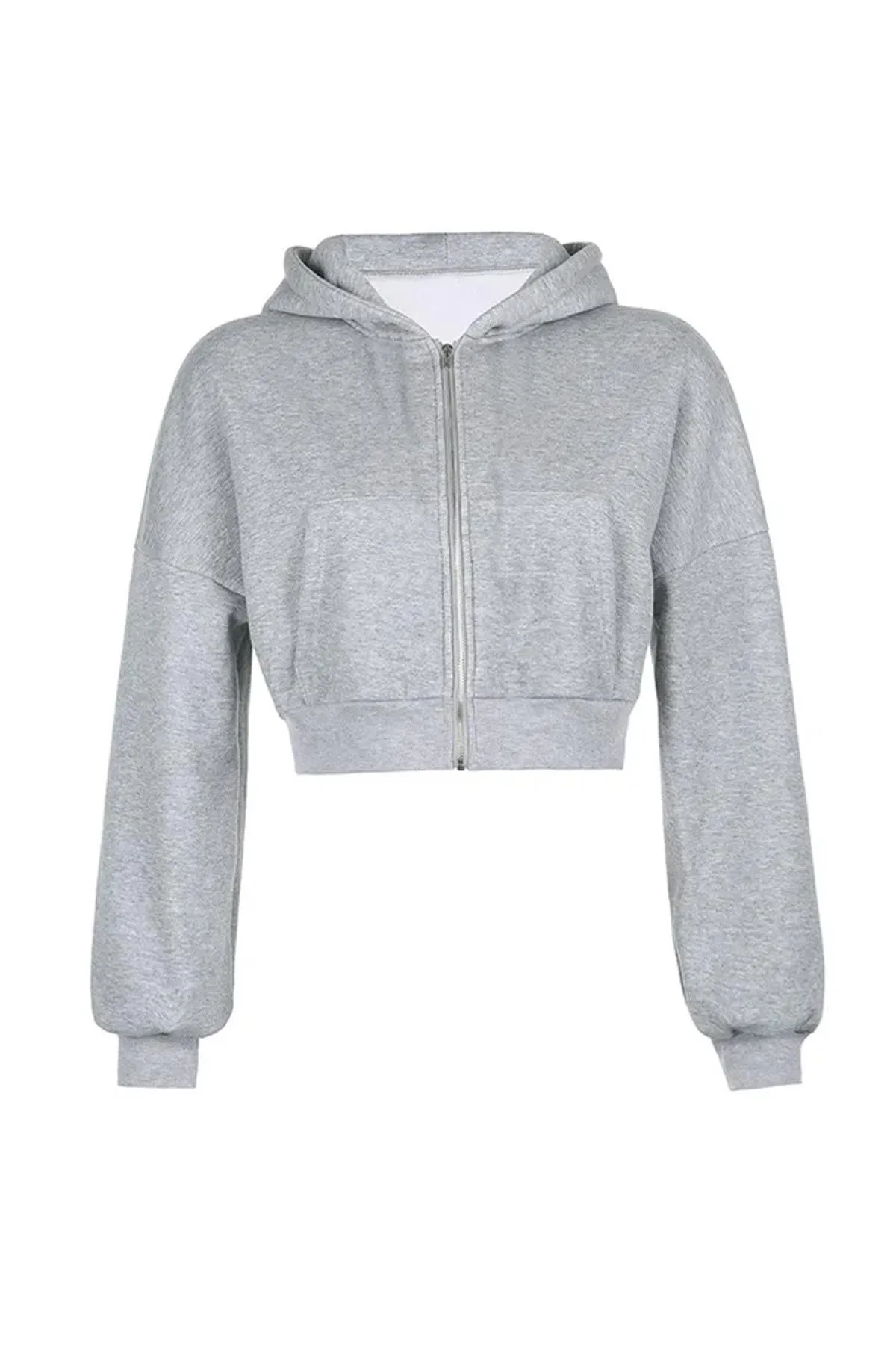 Streetwear Fermuarlı Uzun Kollu Gri Crop Hırka