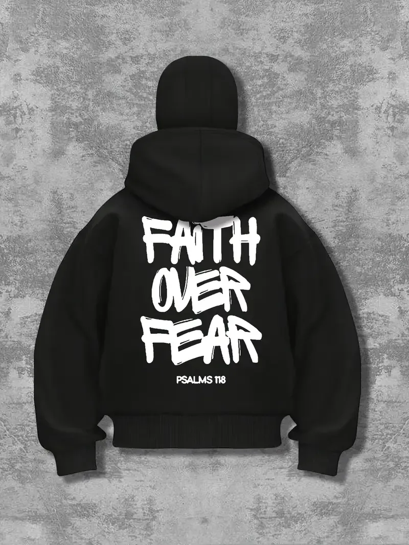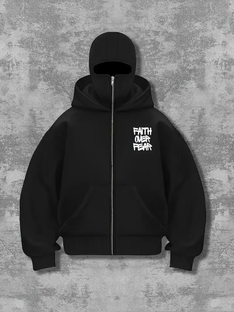 Unisex Oversize Siyah Fait Over Fear Baskılı Maskeli Hoodie