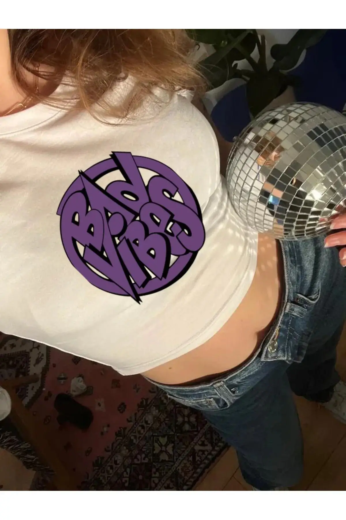 Y2K Beyaz Kadın Bad Vibes Baskılı Kısa Kollu Crop