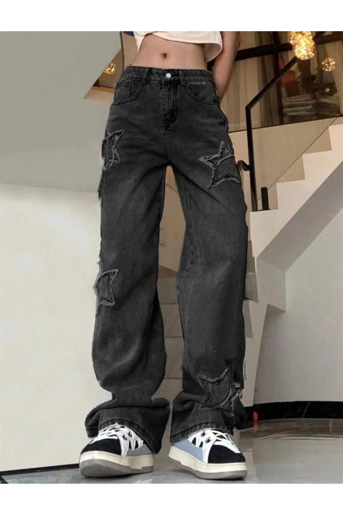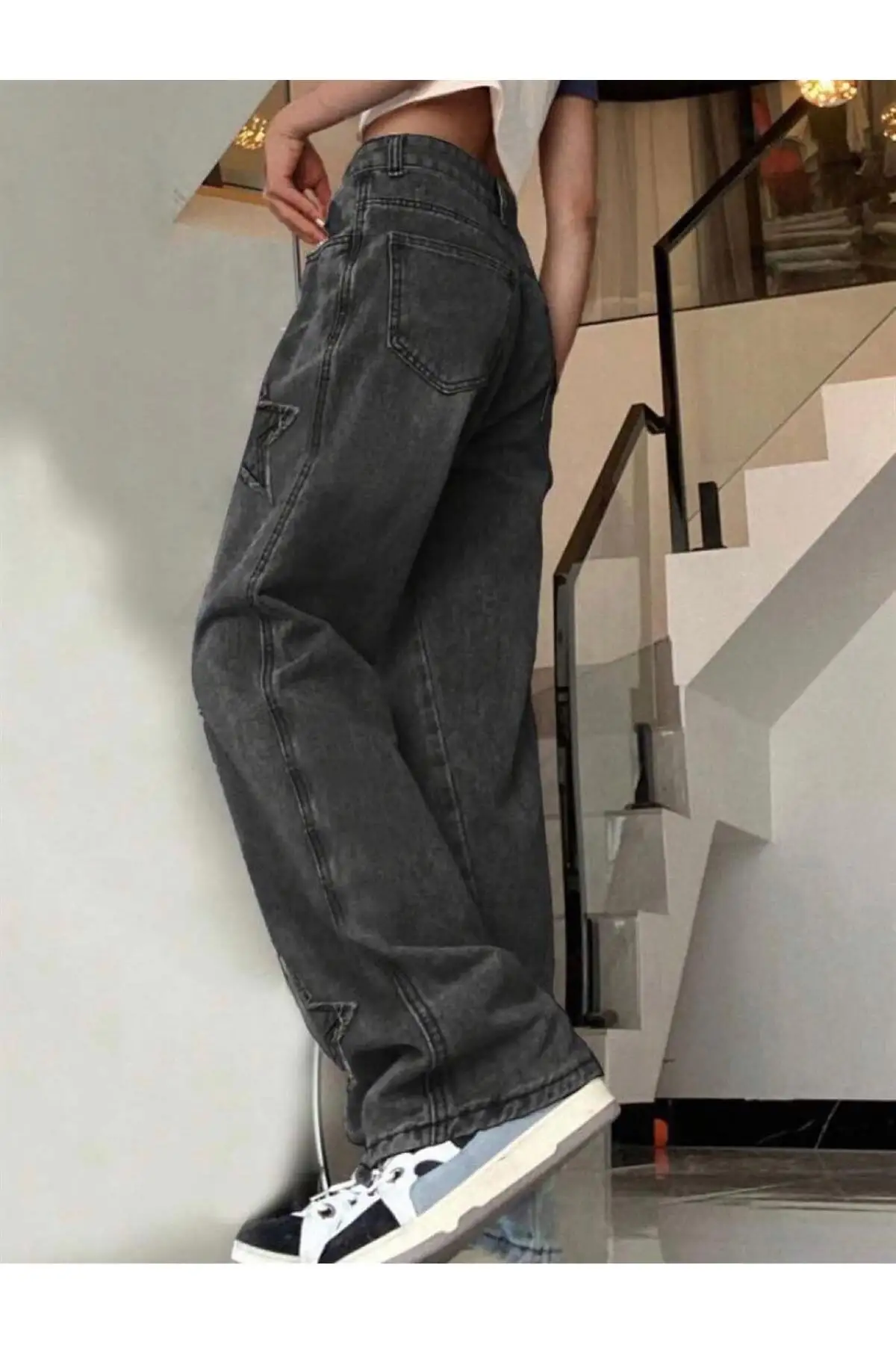 Y2k GRİ YIKAMALI BAGGY YILDIZ DETAY Star Detail Baggy Panth