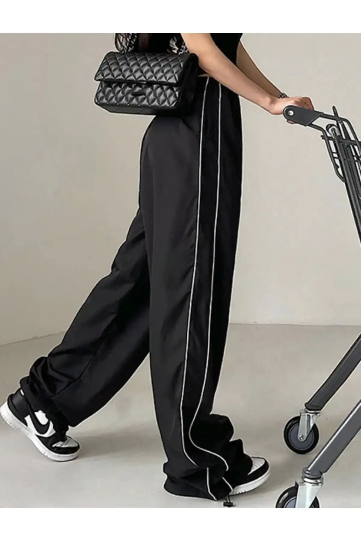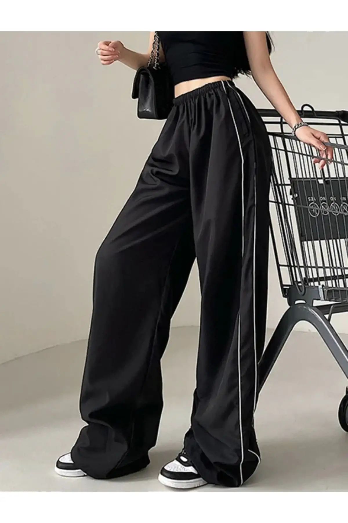 Y2k Siyah Şeritli Unisex Paraşüt Pantolon /eşofman