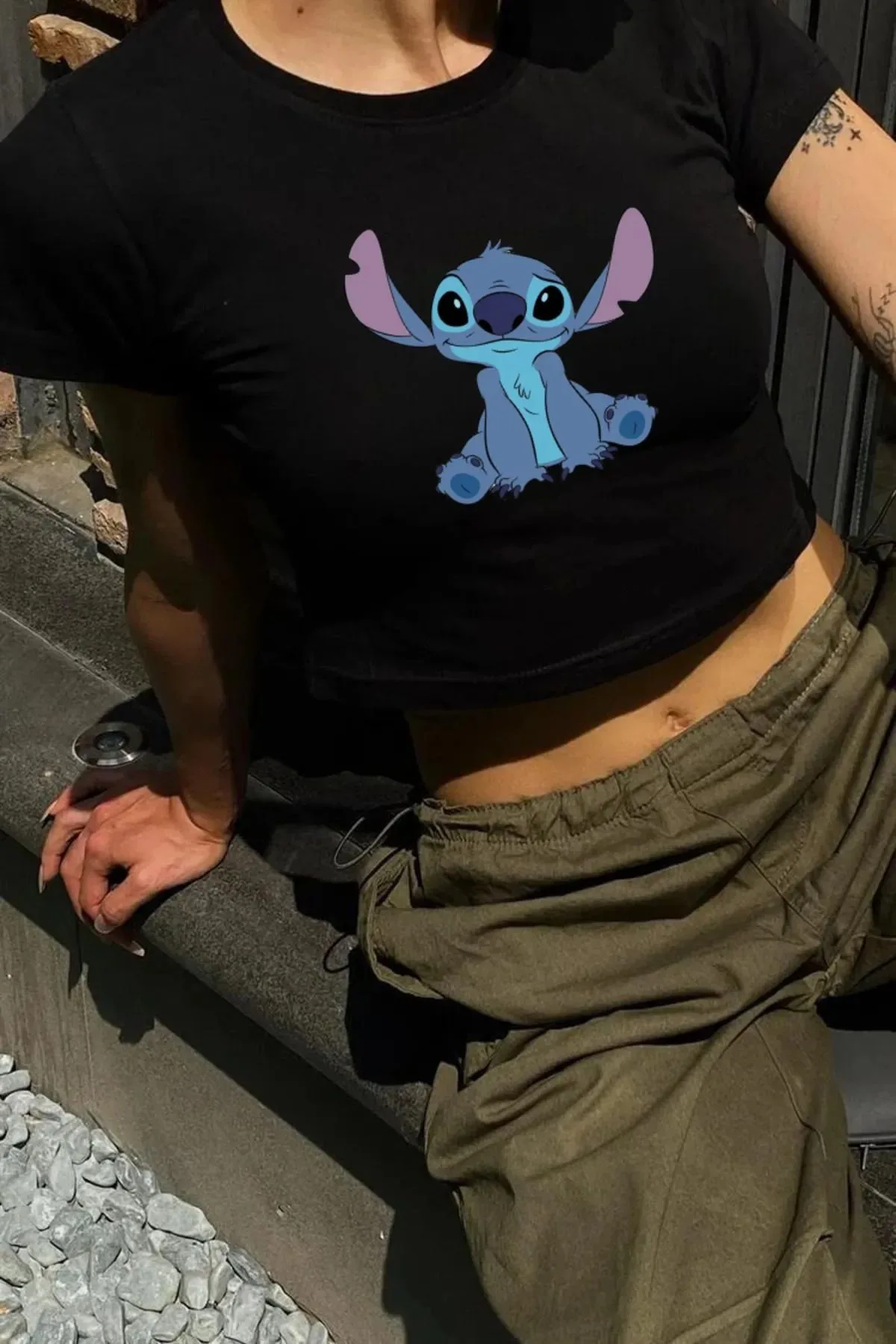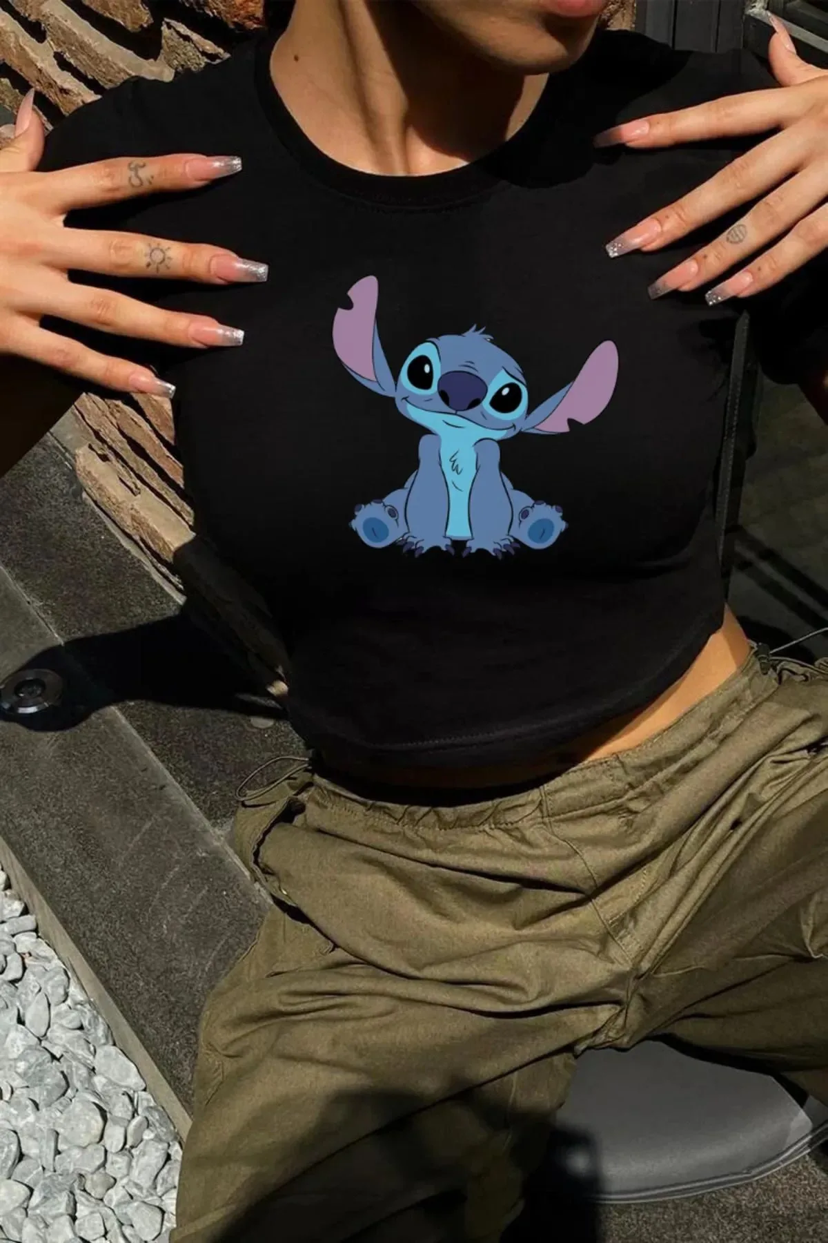Y2K Sokak Stili Oturan Stitch Model Baskılı Kısa Kollu Siyah Crop Body