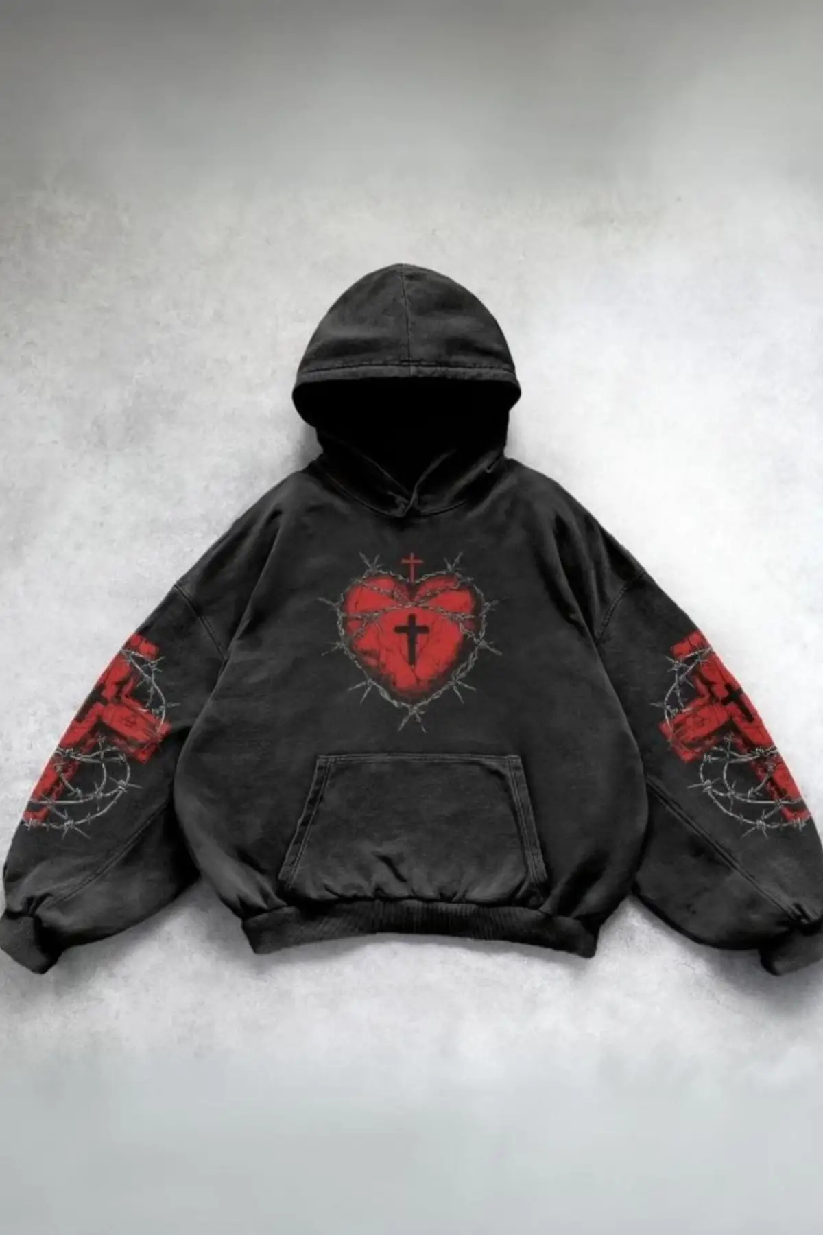 Yeni Siyah Gothic Barbed Wire Heart Cross Kapüşonlu Sweatshirt