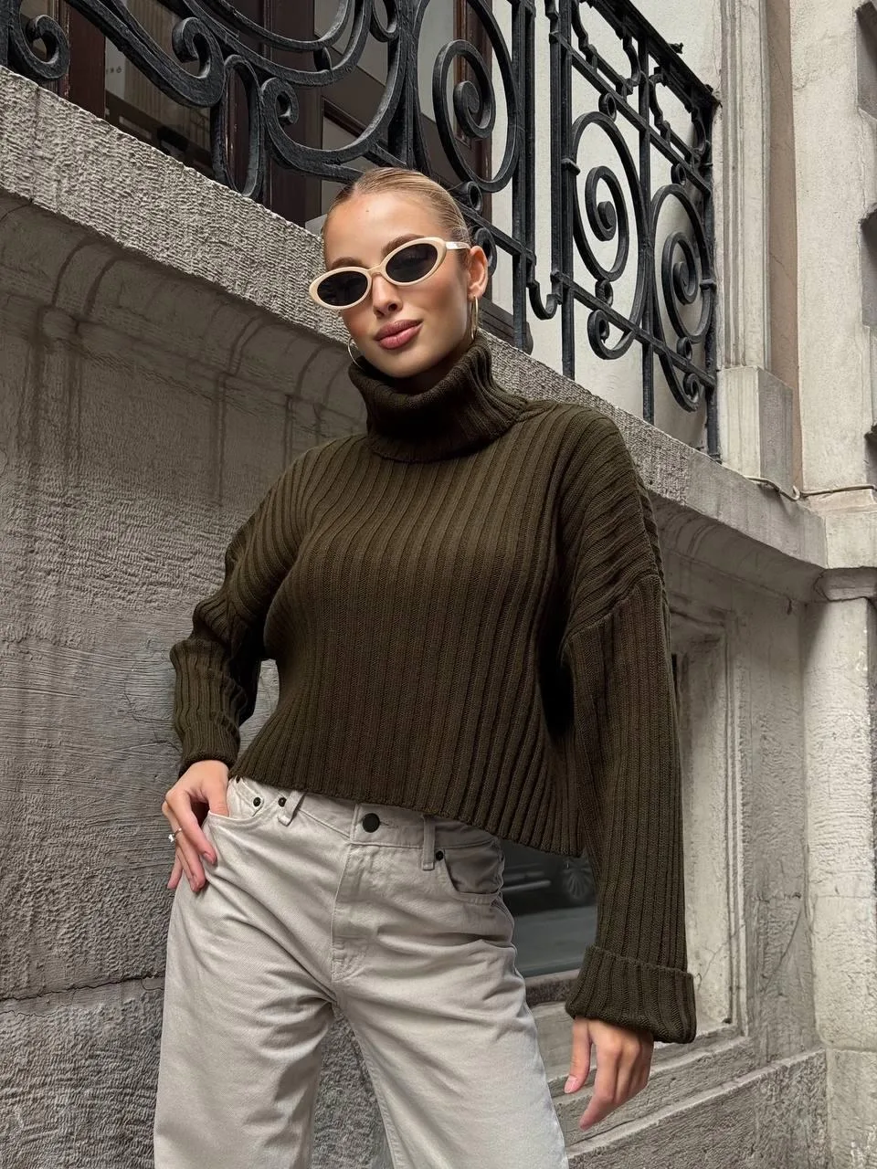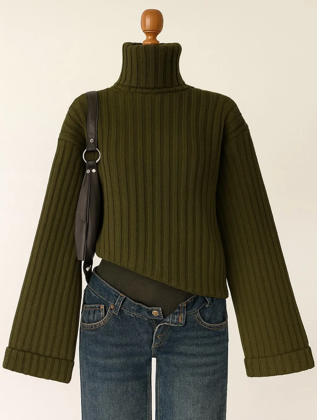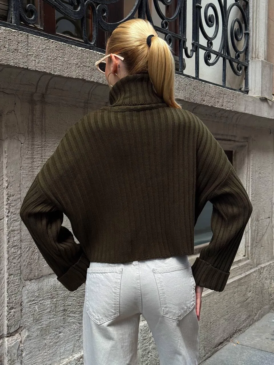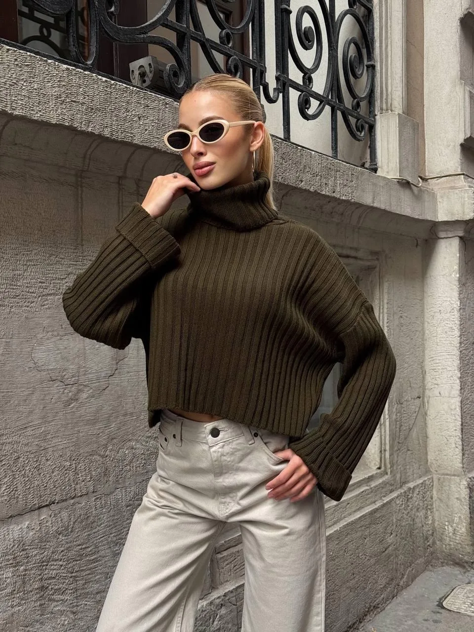 Yeşil Haki Boğazlı Triko Örme Kazak