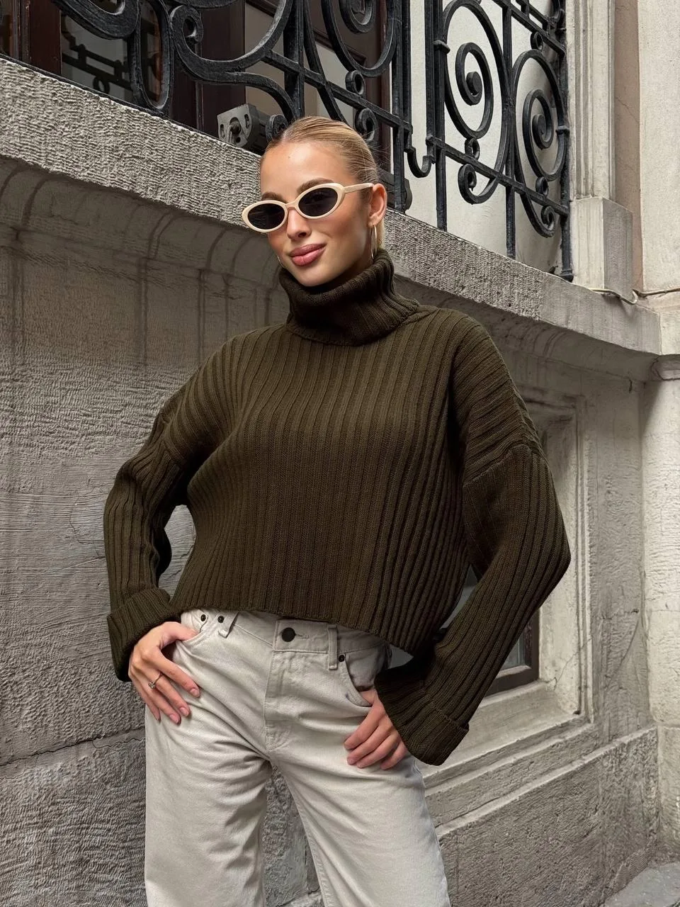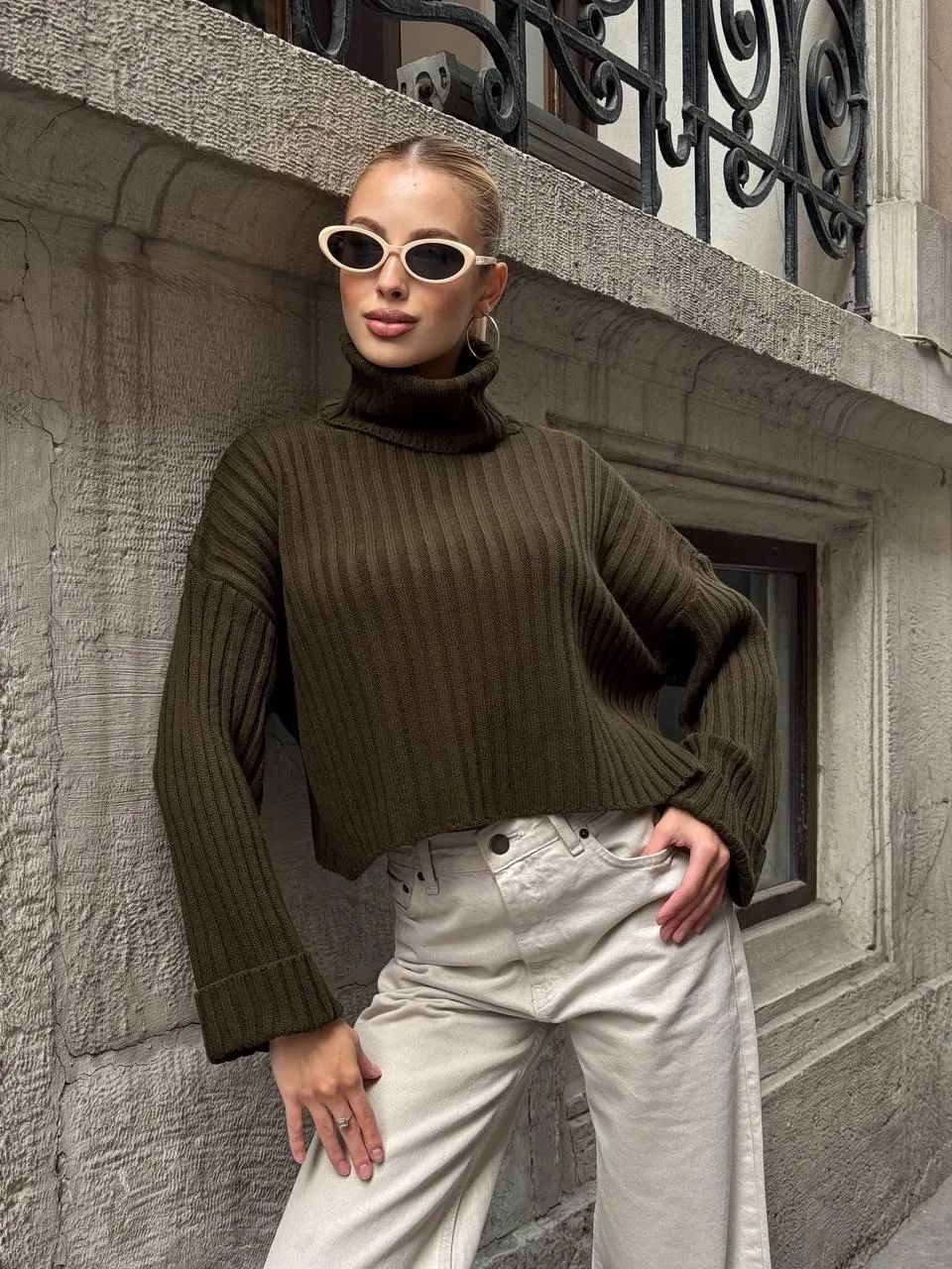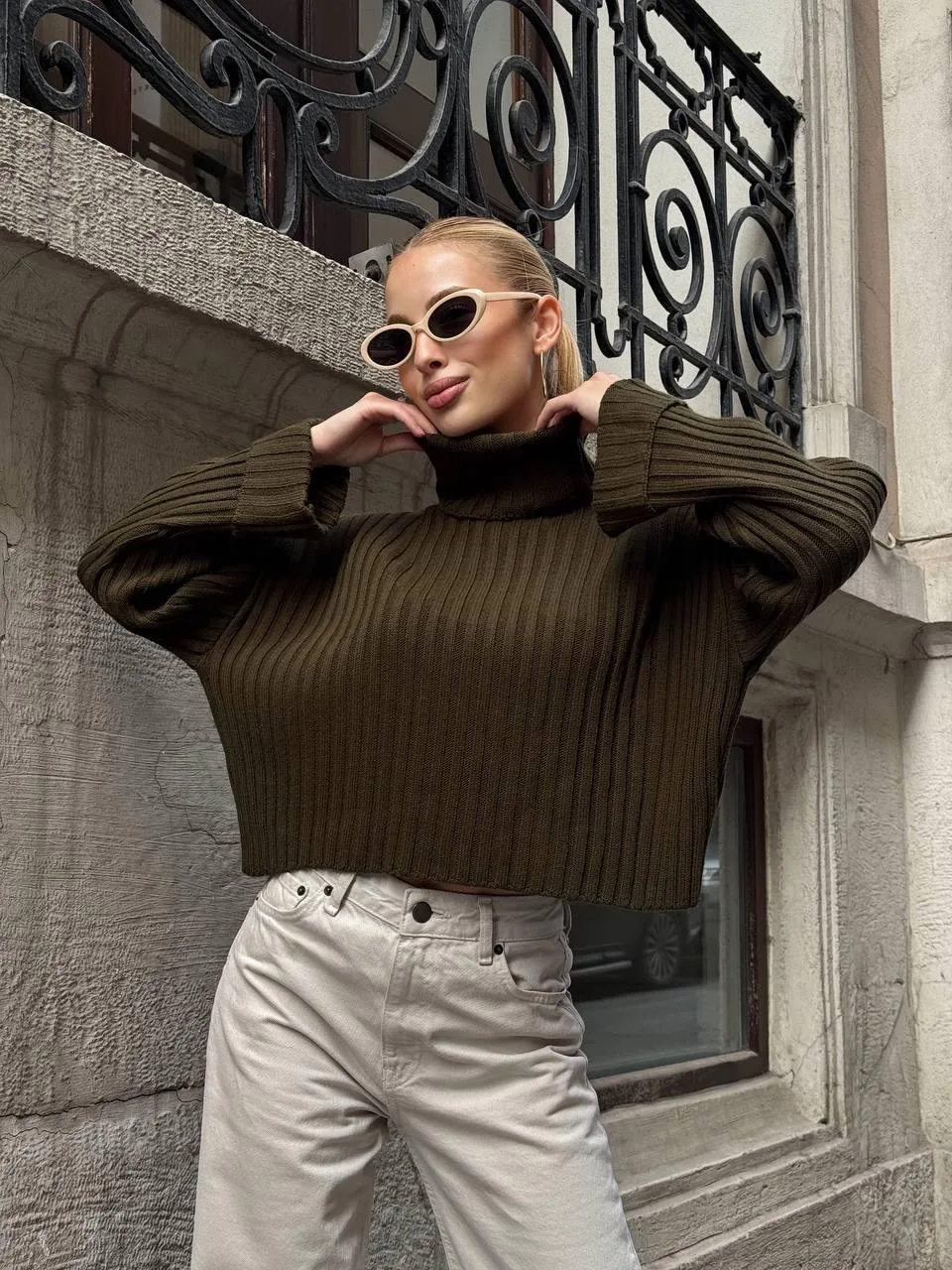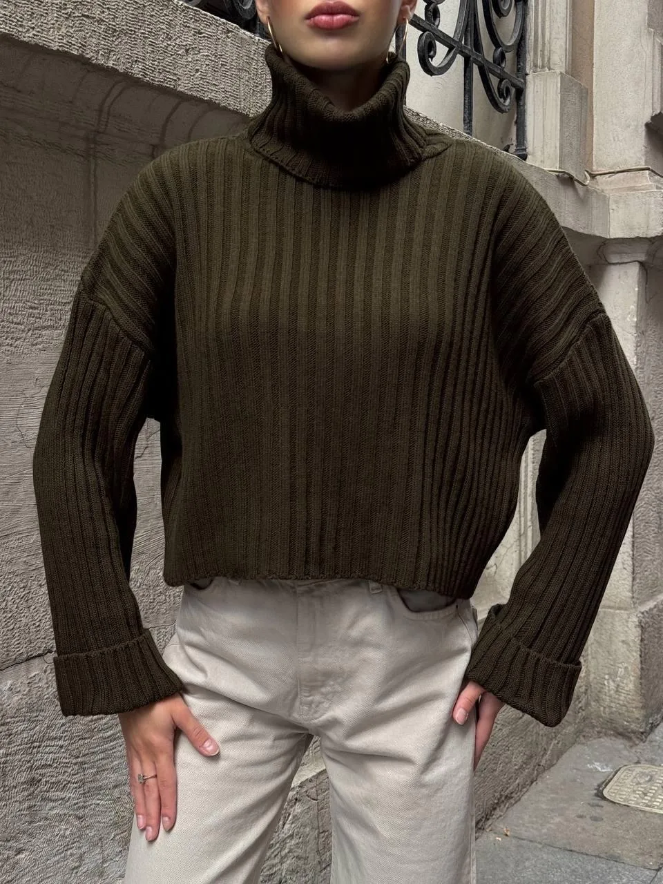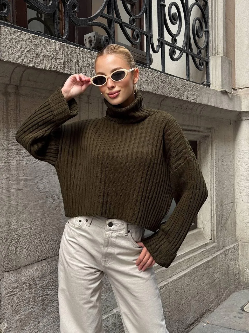Yeşil Haki Boğazlı Triko Örme Kazak