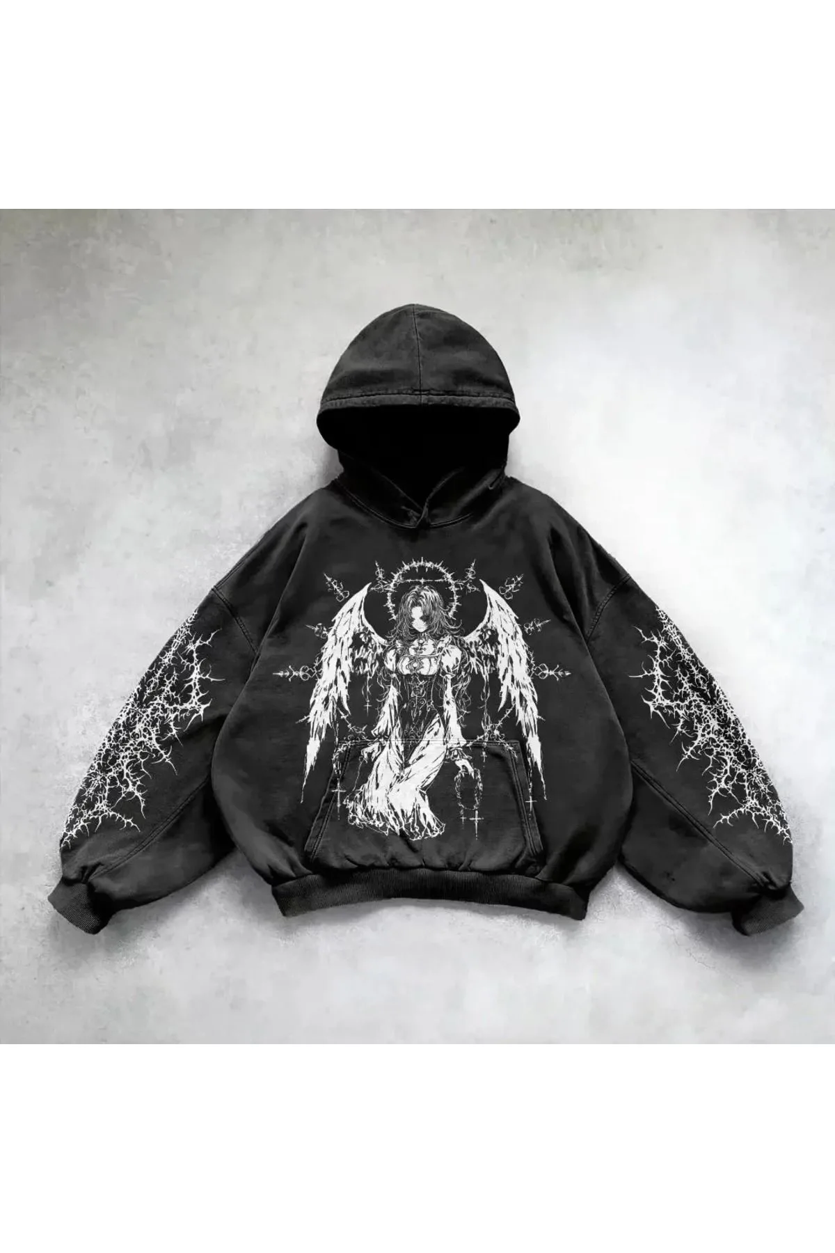 Yıkamalı Thinking Angel Woman Gothic Kapüşonlu Sweatshirt
