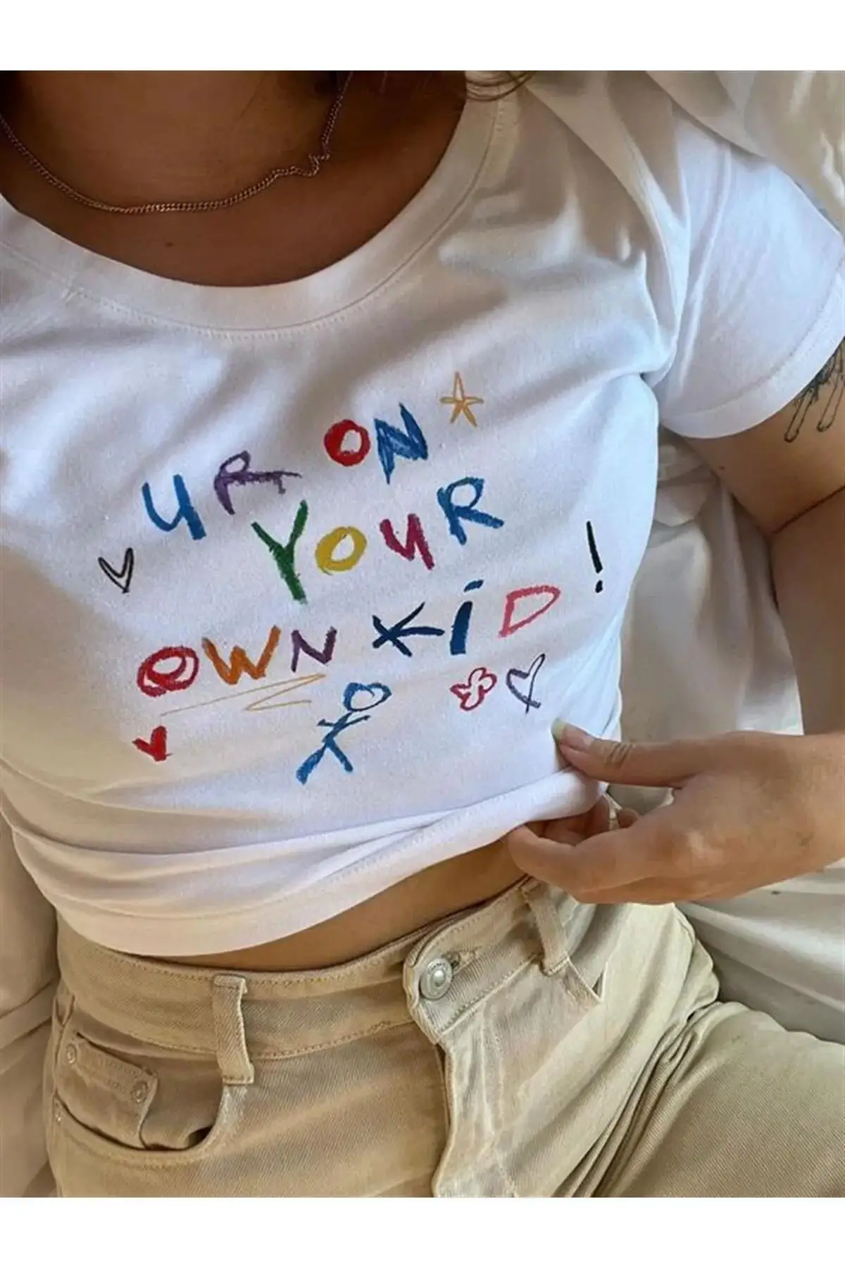 YOUR OWN KİD BASKILI BEYAZ CROP